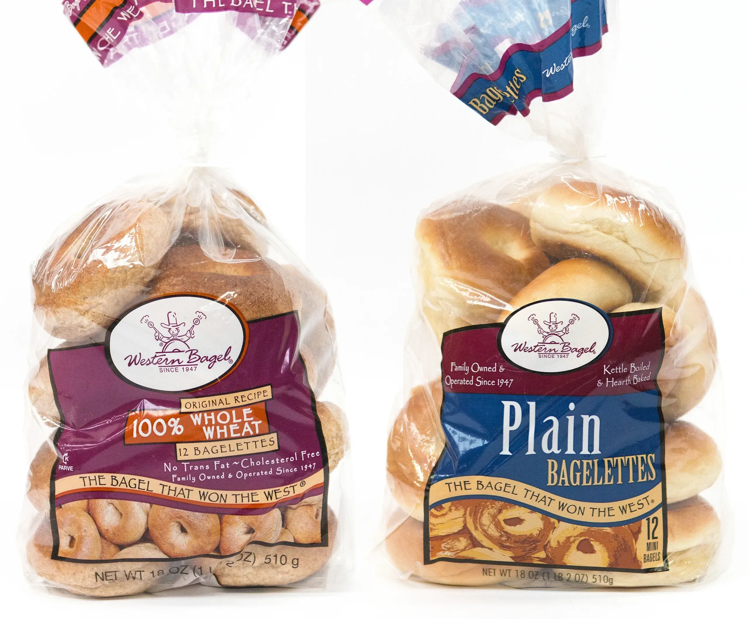Our Western Bagel Bagelettes are just like our classic bagels, but mini! We make two flavors of Bagelettes, plain and whole wheat.