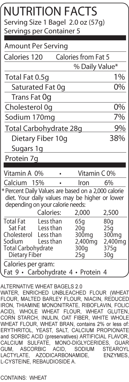Wheat Bread is always a healthy option and that’s why we made a low-carb wheat bagel. Our delicious Alternative Bagels are baked using whole grain goodness with only 10 grams of fiber and a mere 120 calories, they’re perfect for any snack or meal!